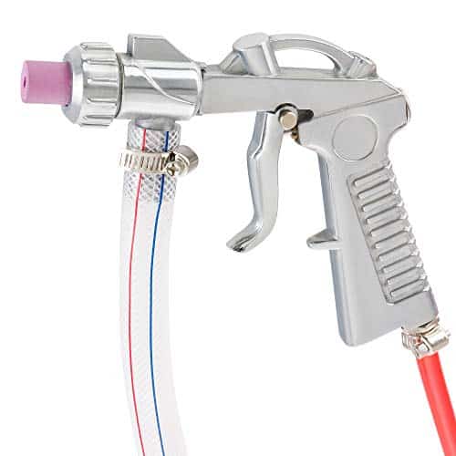 En revanche, la sableuse à siphon est équipée de deux tuyaux séparés, l'un relié au fond de la poignée du pistolet et l'autre fixé directement sous le canon du pistolet. Lorsque la gâchette est pressée, l'air comprimé crée une aspiration qui entraîne le produit abrasif jusqu'au canon du pistolet où il est tiré. Contrairement au modèle à alimentation par gravité, le réservoir du siphon est situé sous la buse du pistolet, d'où l'utilisation de l'aspiration pour aspirer l'abrasif.