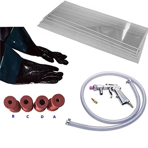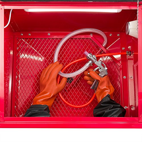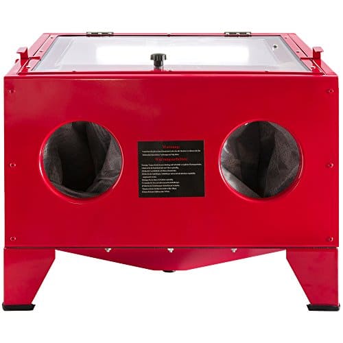 La sableuse Arebos est une armoire de paillasse et un kit de pistolet qui convient pour enlever la rouille ou la peinture des petites pièces. Il est équipé d'une grande fenêtre en plexiglas sur le dessus qui offre une bonne visibilité, ainsi que d'un échappement filtré.